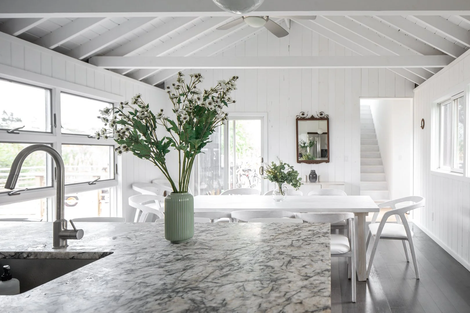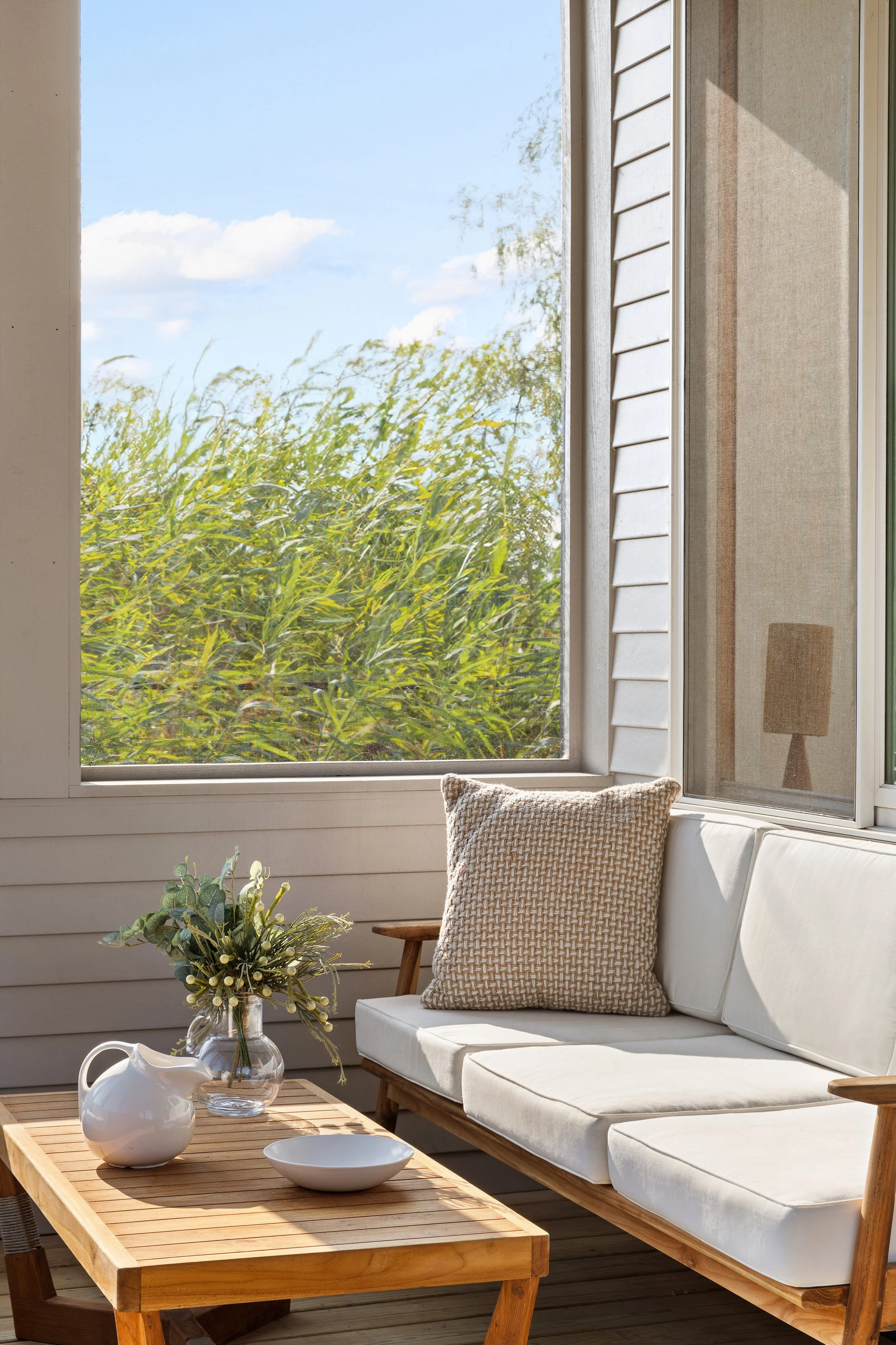 In order to expand this home, the modern addition juxtaposes with the original, traditional cottage. Standing confidently adjacent to the original structure, this new space with oversized windows and squared edges provides additional living and working spaces with great views and contemporary beach outlook. The interiors are similarly clean lined and have custom made furnishings that complement the relaxed and easy living feeling.